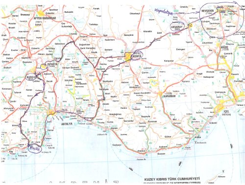 Vi skal lide oss gjennom 750 kilometer i minibuss. Litt annen rute denne gangen. Dvs samme rute tilbake til Konya. Vi for står det slik at vi skal ha et stopp i Aksarai, med noe kameler og greier. Det er umulig å få klarhet i hva dette var for noe. Videre snakkes det om Burgur. Dette er en by som ligger betenkelig langt unna alfarvei. Vi forsøker å få brakt klarhet i dette, men hverken vår «profesjonelle» guide eller sjåfør kan gi oss konkrete hint. Jeg bretter ut kartet, men får ingen gode svar annet enn det er over 60 mil til Burdur. Såå intelligent! Vår guide fikk svært lite tips.
