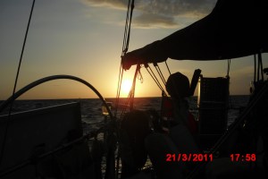 Etter hvert får vi både forseil og Genoa opp og det øker farten noe. Med hjelp av motoren holder vi 6 – 7 knop.