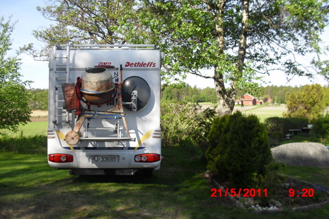 Minigraver er innleid og min bror Bjørn trakterer denne. Hull i bakken blir til og rørene settes ned. Blandemaskin har også Bjørn tatt med på baksiden av bobilen sin.