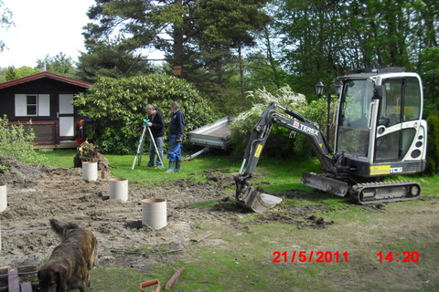 Nå kan endelig nybygget påbegynnes. Først og fremst graves det ned bærepilarer. Vi velger denne løsningen framfor grunnmur fordi vi ligger kun 70 cm over havet. I ekstreme fall kan springflo oversvømme området og derfor har vi også lagt grunnpilarene ca 20 cm høyere enn de gamle.