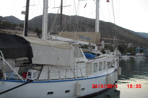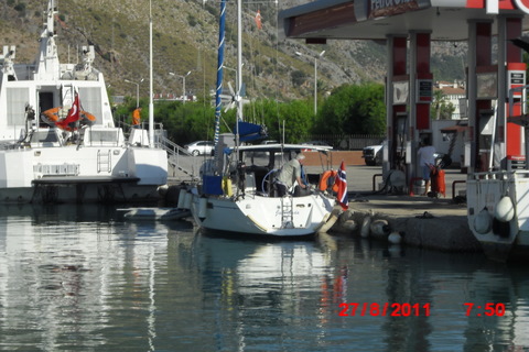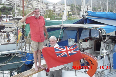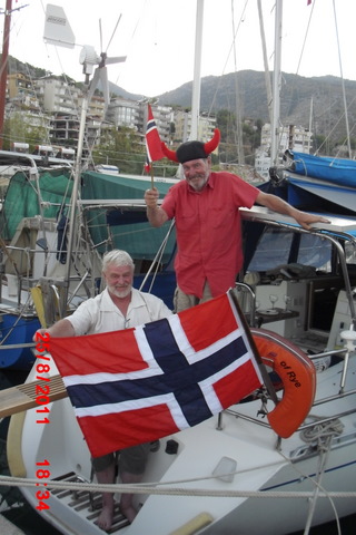 I mellomtiden har også Knut Gulbrandsen ankommet Finike. Han er lykkelig eier av båten Jacaranda som han kjøpte av en engelskmann. Båten ble deretter seilt ned fra Marmaris til Finike i våres. Siden dette har Knut slitt hardt for å få båten under norsk flagg, registrert i NOR. Møtet med byråkratiet, spesielt i Norge, er en hel historie for seg selv, som forhåpentlig blir videre utdypet i Knut`s egen blogg etter hvert. Men det utløste i alle fall en ordentlig flaggseremoni.