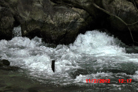 Det var imidlertid så langt vi kom inn i skaret denne gang. Oppslag var satt opp overalt at grunnet den høye vannstanden i elva, var det farlig og derfor forbudt å fortsette.