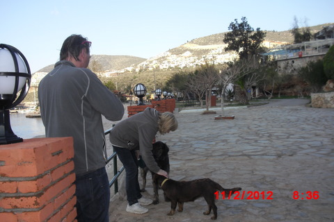 Men denne er svært så kosete og vil være venn med både LisE og Sala. Neste morgen drar vi raskt videre. Det er kjølig og fremdeles skygge i Kalkan. Vi drar likegodt til Patara, en velkjent oldtidsby og en populær badestrand. for å spise frokost.