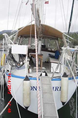 Da er vi etablert i Ucagiz, Honeybird har fått sin egen mooring og ligger vel fortøyd med akterspeilet inn mot brygga.
