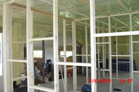 Påbygget er under romoppdeling innvendig og elektrikkerrør er trukket rundt i tak og vegger.