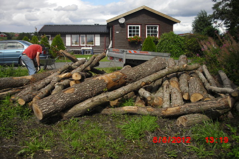 Siden kommunen måtte felle noen trær i forbindelse med sin avløpsgraving, lovet de oss kompensasjon med å forsyne oss med fire favner ved. Vi så for oss ved ferdig kløvd ved i sekk fritt levert hytta.