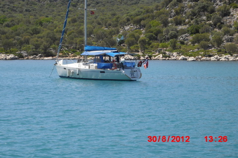 Jacaranda blir ikke med oss grunnet lekasje i propellinntaket og må gå til Kas marina for reparasjon. Bjørn og jeg blir med som mannskap.