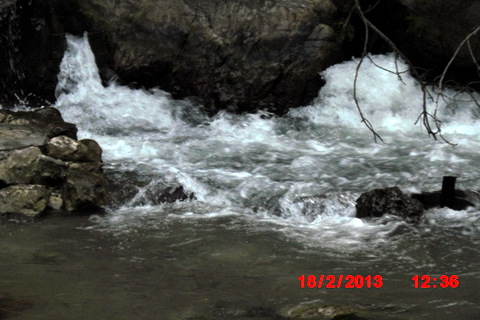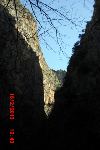Saklikentkløften er et skar, bare noen meter bredt. Den er 18 km lang, men bortsett fra inngangspartiet med sin 100 meter gangvei, er det umulig å komme videre på denne tiden av året. Vannføringen er altfor stor til det. Om sommeren kan man klatre, vasse og gå noen kilometer lengere innover.