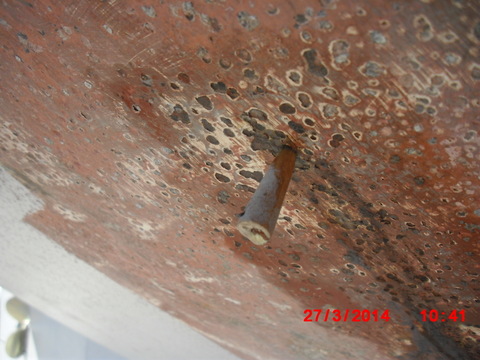 En ulykke kommer sjelden alene. Det kommer væske ut av skroget. Det lukter umisskjennelig diesel. Skrogveggen er en del av dieseltanken, men hull inn i tanken er ikke særlig hyggelig, men foreløpig får vi bare midlertidig stanse lekasjen ven hjelp av en treplugg. Hvordan reparere skaden? Å sveise med diesel i tankene er umulig. De må eventuelt tømmes, luftes ut, fylles med vann og skylles. Er det svakhet i større deler av skroget? Det må vi bare finne ut. Vi trenger en skrogmåling. Verftet kan skaffe spesialist til en pris av 1000 euro, men via bekjente får jeg tak i godkjent spesialist som gjør jobben for 200 euro.