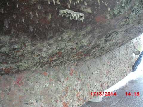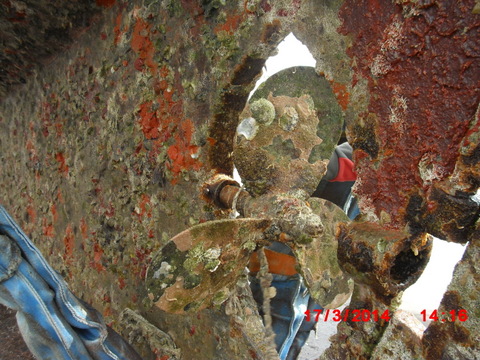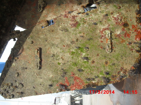 Skjellene er digre som østers og sitter som limt i skroget. Slik så skroget ut etter høytrykkspyling og det tok oss en hel uke bare å få rengjort båten under vannlinja.
