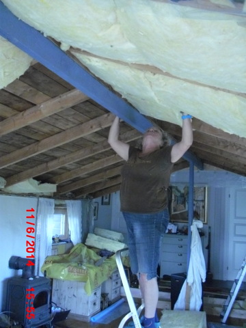 Inne begynner vi også å se slutten på et omfattende arbeid. Taket isoleres og paneles.